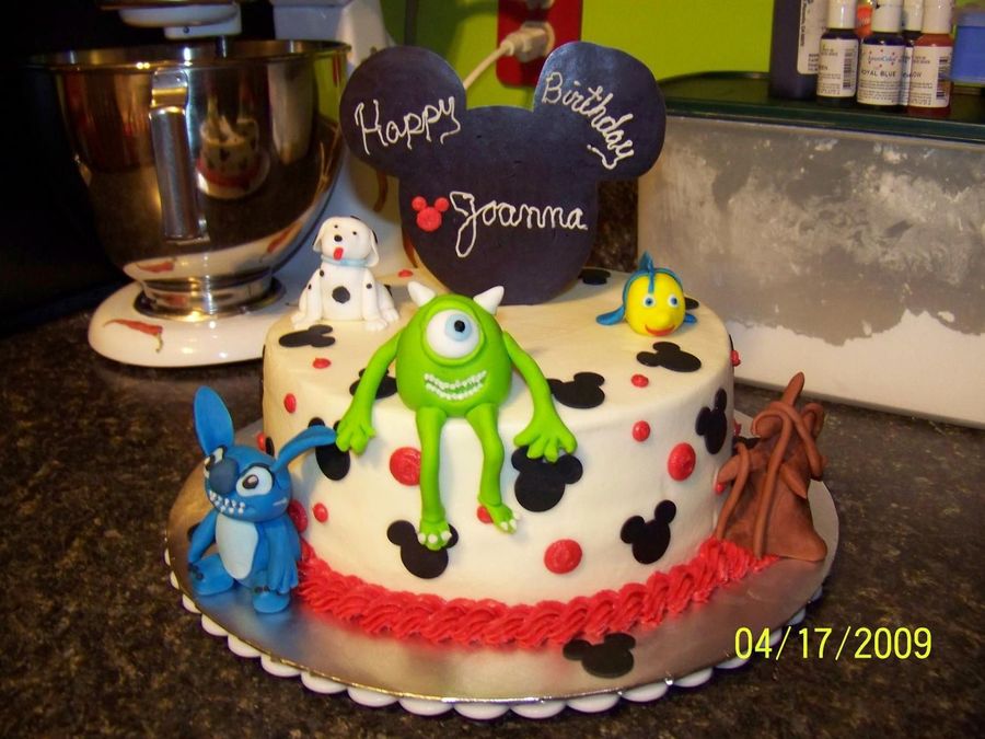 This was a gift for my daughters friend. She was having a Disney party. All of the figures are made out of fondant and gumpaste. My daughter actually made the dalmation and flounder all by herself. The Mickey ears on top are chocolate.