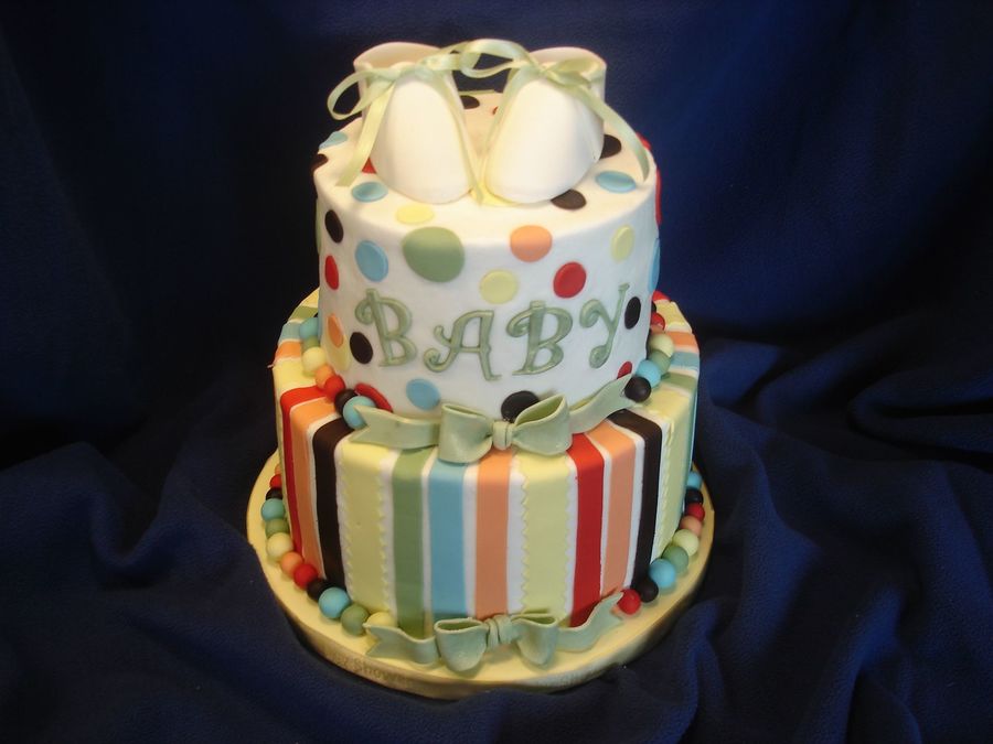 Colors were to reflect the baby bedding from The Land of Nod. The 6" is WASC and the 8" is chocolate with raspberry filling. Iced with Sugarshacks buttercream recipe. Booties and lettering were made from Nicholas Lodge's gum paste recipe. Other accents are fondant. Cake board covered with royal icing.