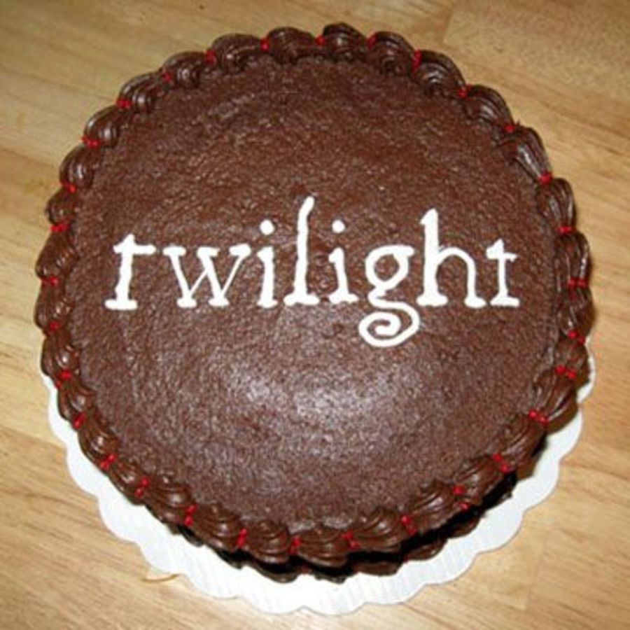 8-inch round cake, one layer dark chocolate fudge and one layer white cake. Hershey's Perfectly Chocolate Chocolate frosting with a layer of strawberry filling. Shell borders with 2 red dots in between. Made for a Twilight movie night.