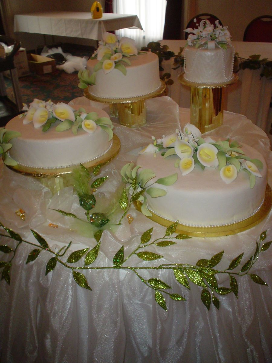 This was the cake table and wedding cake I did for my best friend. She wanted Calla Lillies for her flower and a Lime Curd for the filling of the cake. So I did a lime cake w/lime curd and crumb coated with buttercream /covered in Fondant..