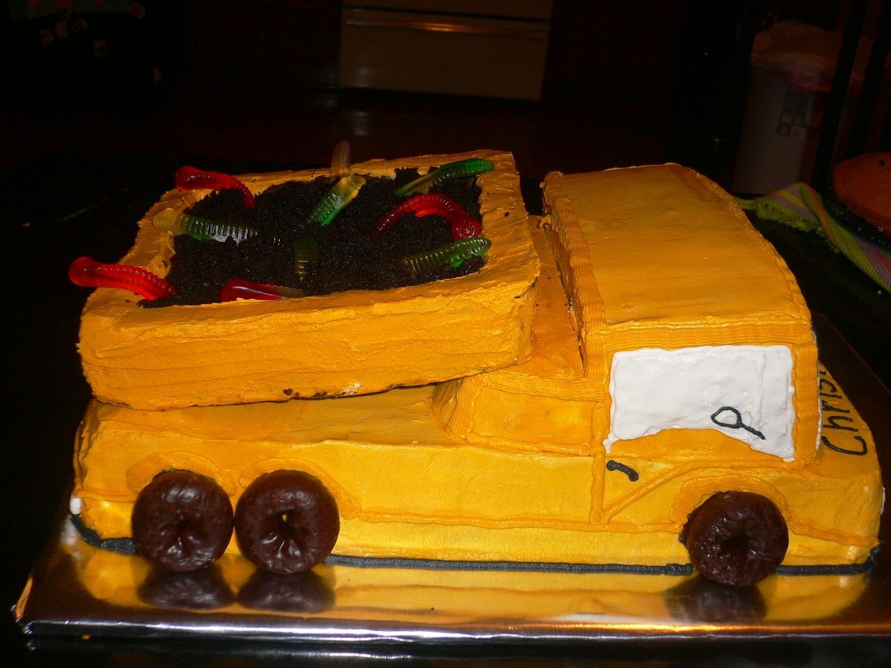 Chocolate cake with chocolate ganache filling. Covered in BC frosting. My very first 3D cake.