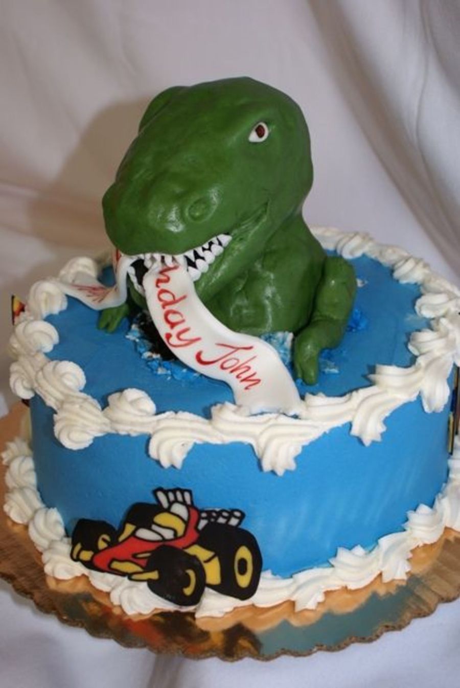 A strange request for a 21st birthday. Boy wanted a dino (molded from rk and covered in mmf) coming out of the cake with racecars and rockets (chocolate transfers).