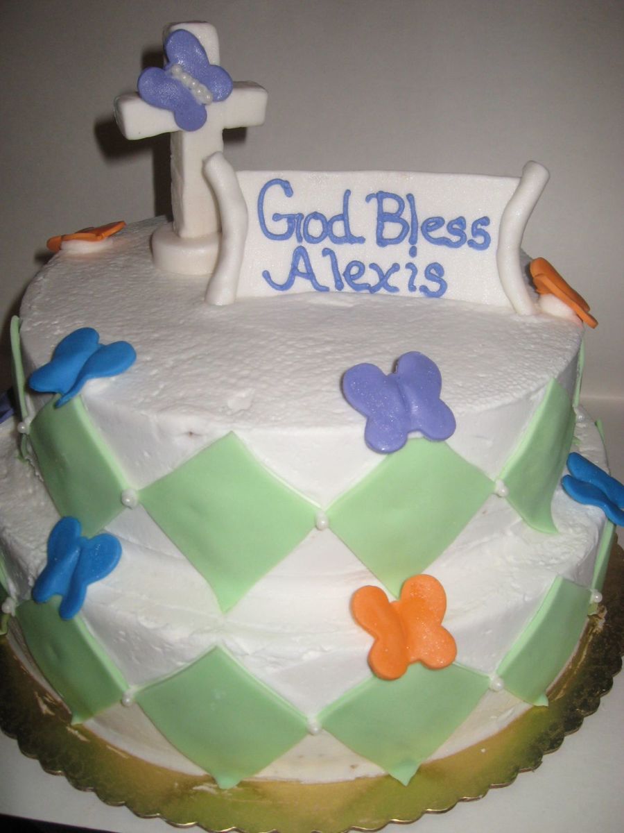 Customer wanted non-trad. pastel colors. Cake is a "funfetti" like cake, with lemon and raspberry filling. Fondant accents, diamonds, butterflies, scroll and cross.