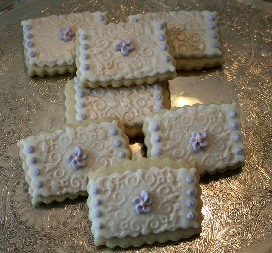 Sugar cookies with fondant, brushed with luster dust and RI flower and dots added.