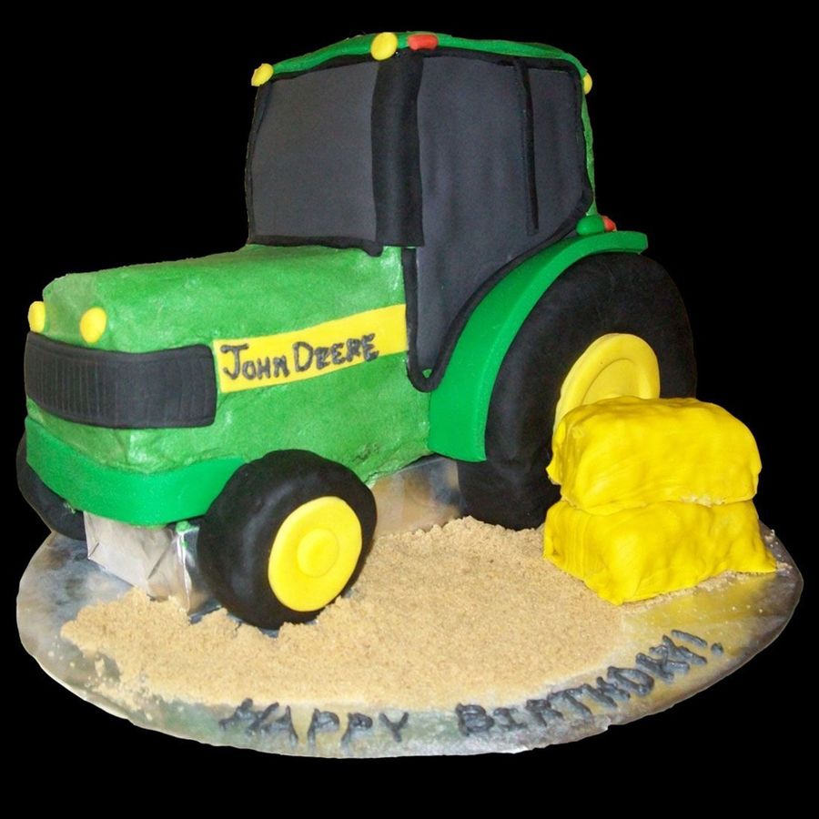 This cake is chocolate frosted with buttercream with fondant decorations. The wheels are rice crispies covered in fondant as well as the hay bales. TFL! :)