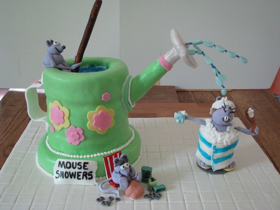 Vanilla durable cake covered in MMF. Gumpaste handle and spout. Mice are made of gumpaste. The larger mouse's body is made of a cupcake wrapped with a fondant towel. His feet and head are gumpaste. This was my entry into a cake show in McKinney, Texas. TFL.