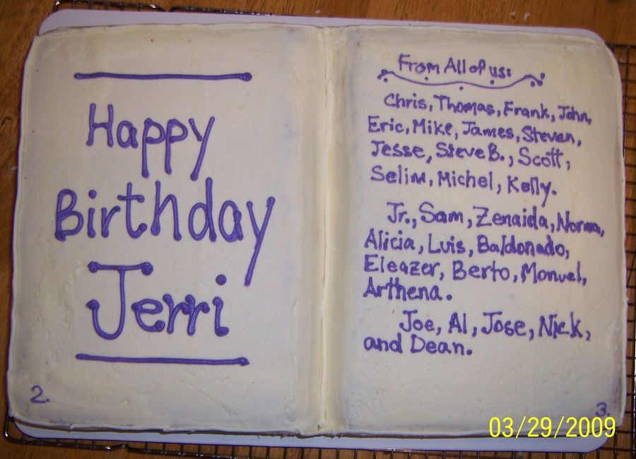 Customer wanted a cake in the shape of a book. Also wanted all the employees' names on the cake. Lots of writing! Yellow cake with buttercream icing. TFL.