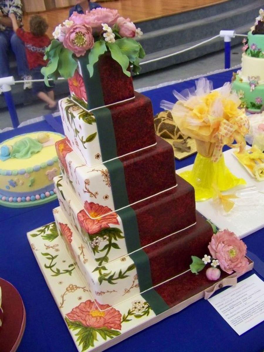 This was my entry for the 2009 Sugar Wonders Cake Show. It won 1st place, Best of Division, and People's Choice! It was so exciting! I hand painted the flowers with airbrush paint. I dipped a wad of saran wrap in brown airbrush color and blotted it on red fondant. The peonies are made of gumpaste.