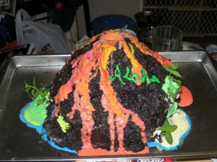 This is a cake I made for my Sister-in-Law's co-ed Luau Baby Shower. The core is a bundt cake with partly cooked brownie shaped on top. I used neon icing tubes for the lava. The '"trees" are fresh mint leaves from my garden. It was a lot of trial and error.