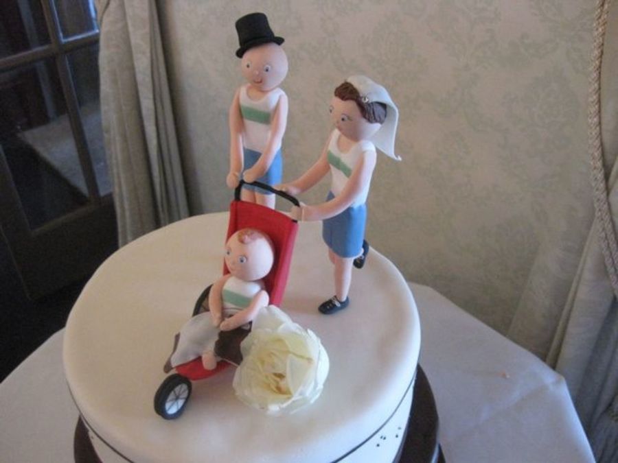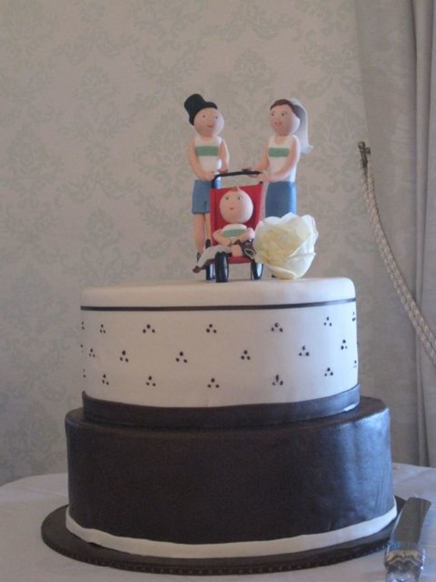 Top tier is white choc mud with raspberry filling, bottom is dark choc mud; both covered in fondant. The bride and groom met through their running club so are dressed in club colours - as is their baby daughter. Figurines are gumpaste/fondant.