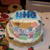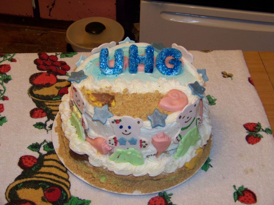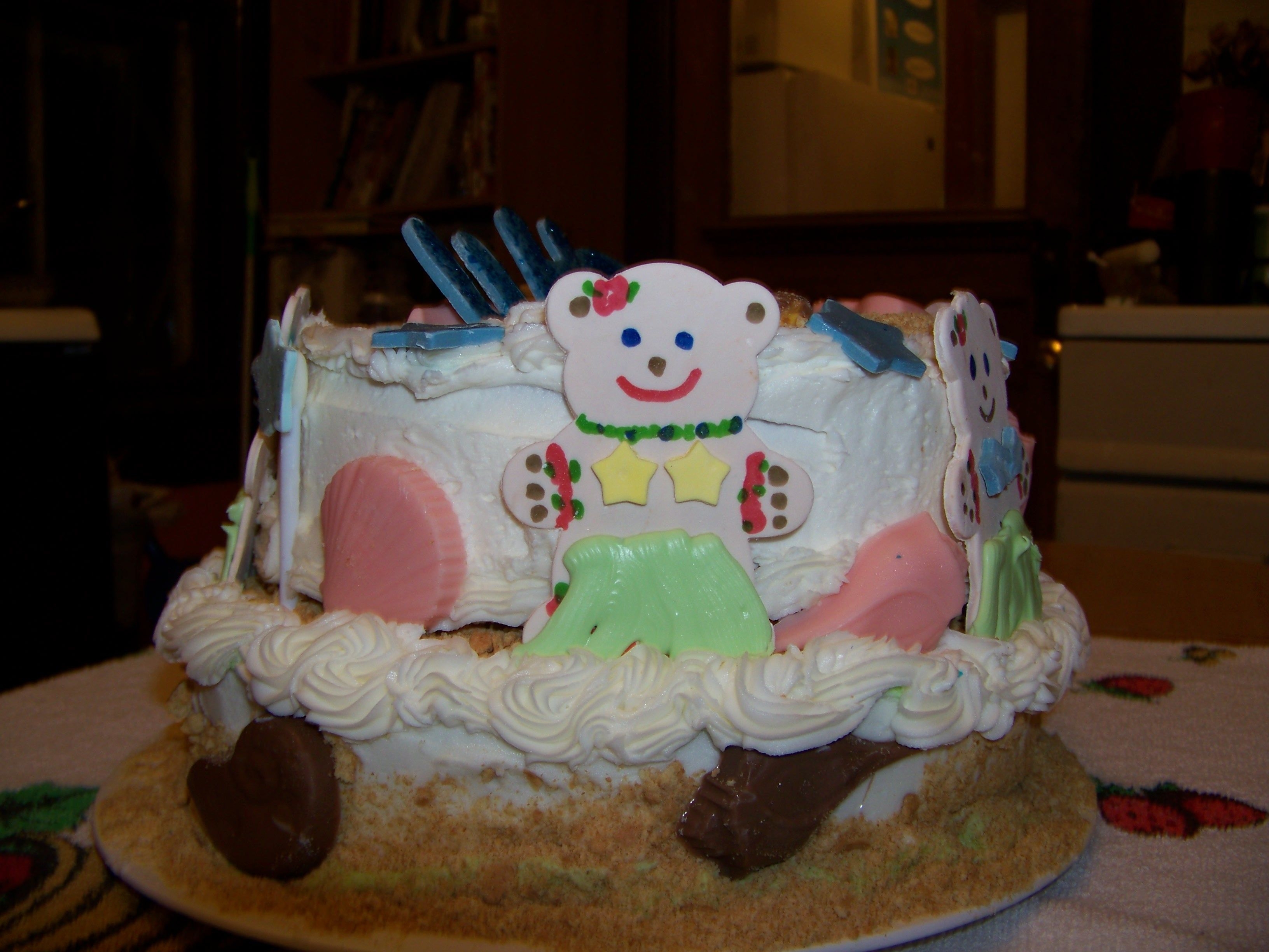 This is a red velvet cake covered in bc. the hula dancers and stars are gumpaste and the shells are candy melts. this is a graduation cake, hula style. It was quite a lot of fun, one of those cakes that just comes together like magic. The beach sand is a combo of graham crackers and brown sugar. This is a smaller cake a single 10in layer and single 8in layer.
