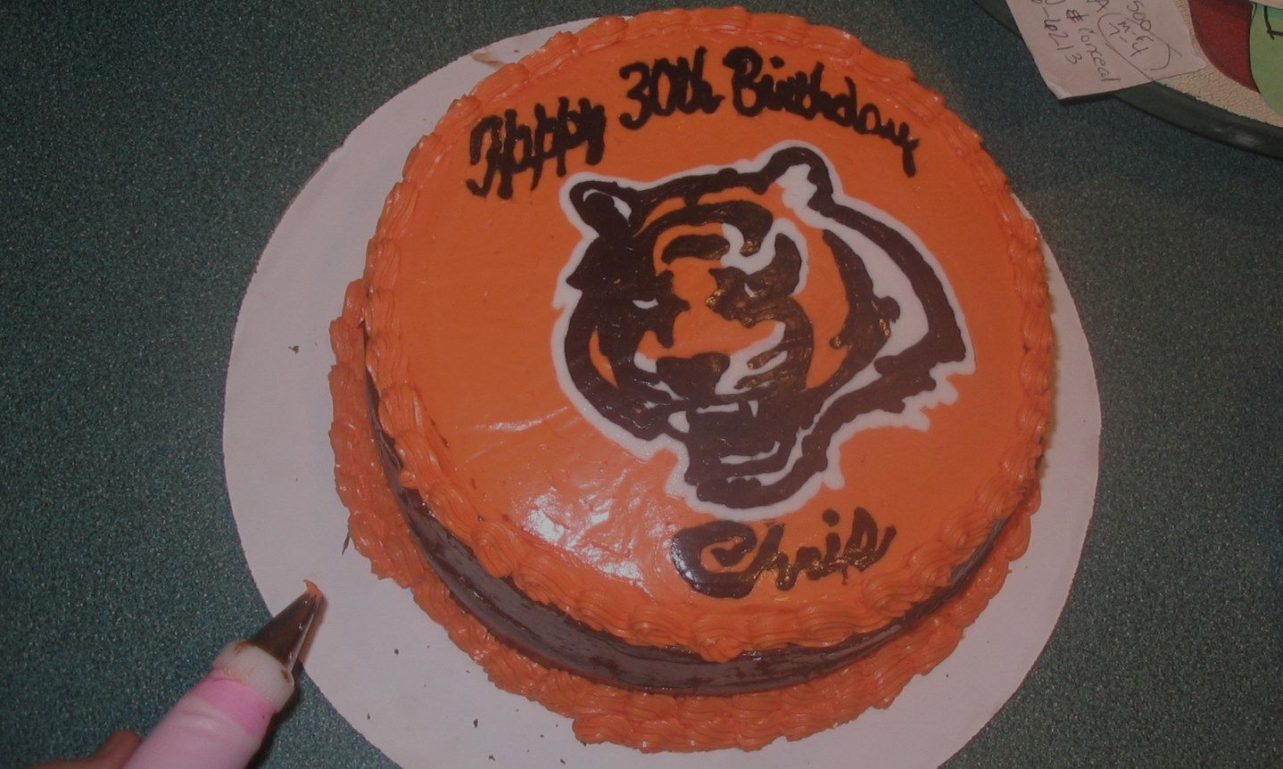 I did this cake for my son's 30th birthday since he's a big Bengal's fan. The tiger was done with a buttercream-overlay.
