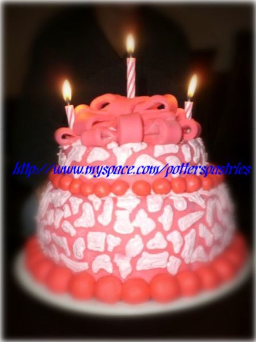 moms birthday cake, pink fondant with free handed strawberry icing leopard spots and a pink fondant gift bow on top