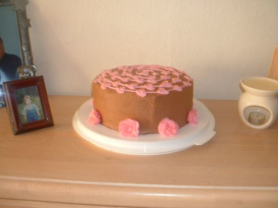 This was my mother's 43rd B-day cake. And my first one for other people. It is Chocolate fudge cake with chocolate chips. Raspberry mousse filling and chocolate buttercream frosting. The roses are also a first for me and also made out of BC.
