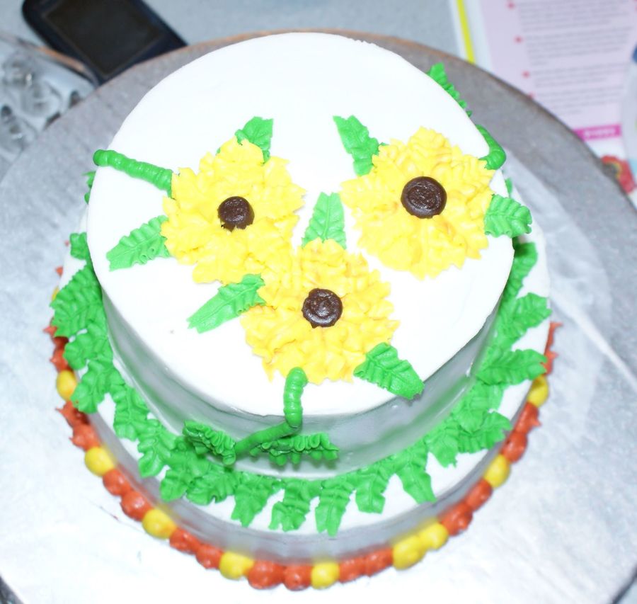 2 teirs of chocolate chip cake w/ chocolate chip cookie dough mousse filling(eggless cookie dough folded into whipped cream) and covered in buttercream. Was for my daughters 15th birthday...I still need to practice sunflowers using buttercream... I could not for the life of me get her to let me do fondant.