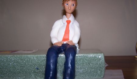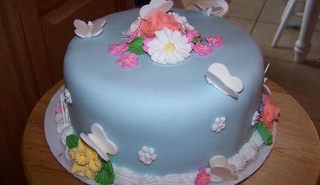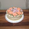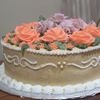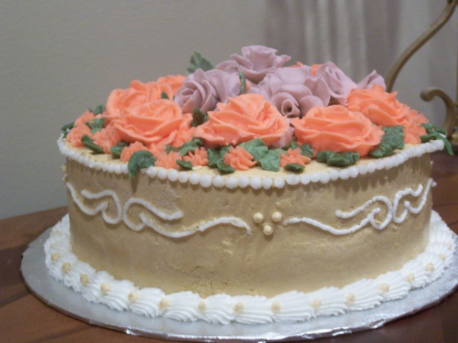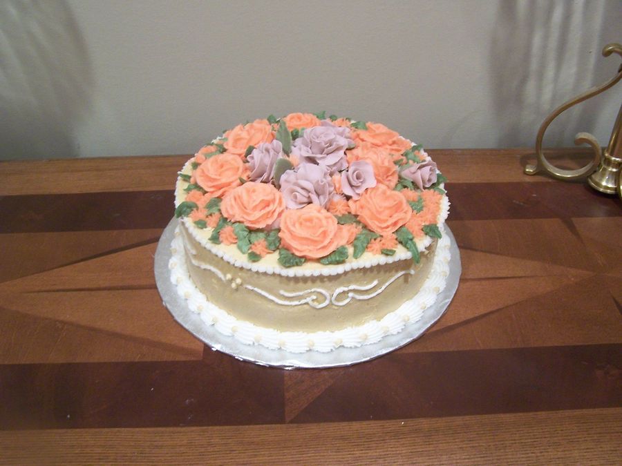 I had done my stacked cake in class and took it apart at home and sent this bottom part of the with my hubbie this morning. (the top of my cake was a dummy) So I took off the fondant roses and put them on this cake, and then made buttercream roses, drop flowers and tons of leaves. The colors are a little bit off the fondant roses are mauve and the buttercream are peach.