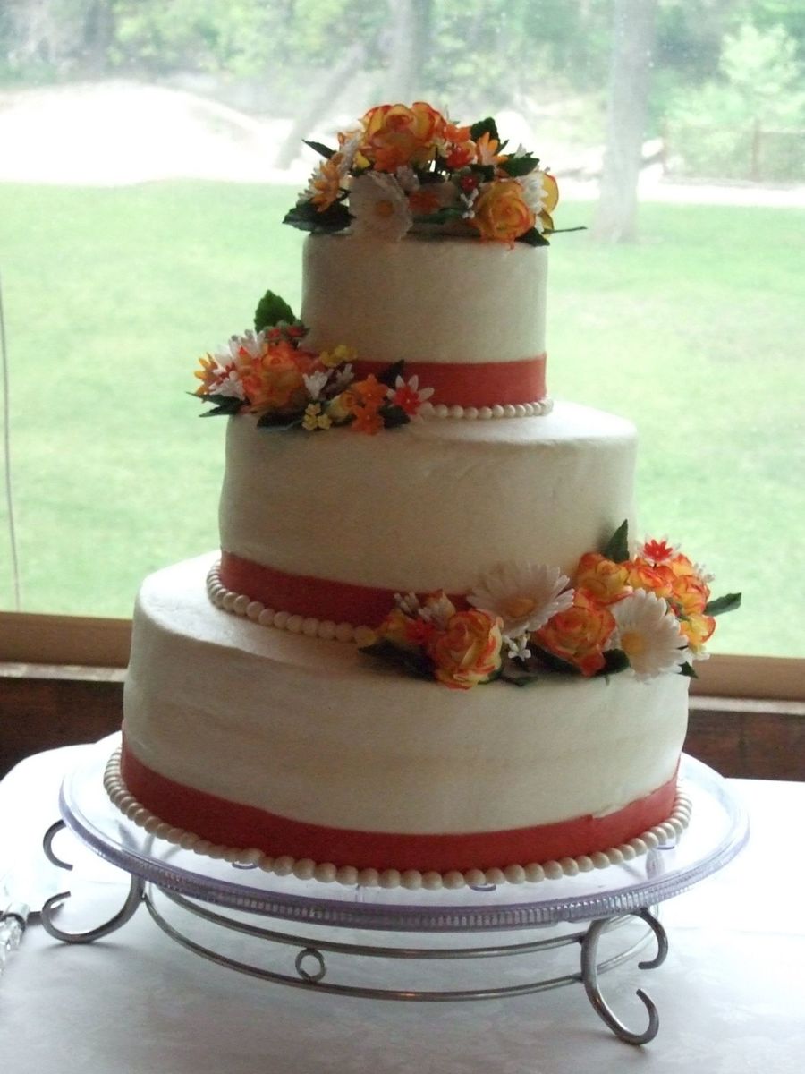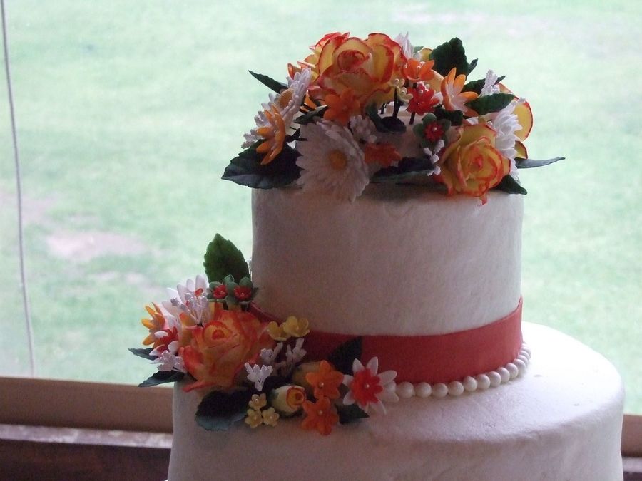 14, 10, 6" round, burnt orange cake w/ apricot filling, gumpaste flowers, chocolate pearls