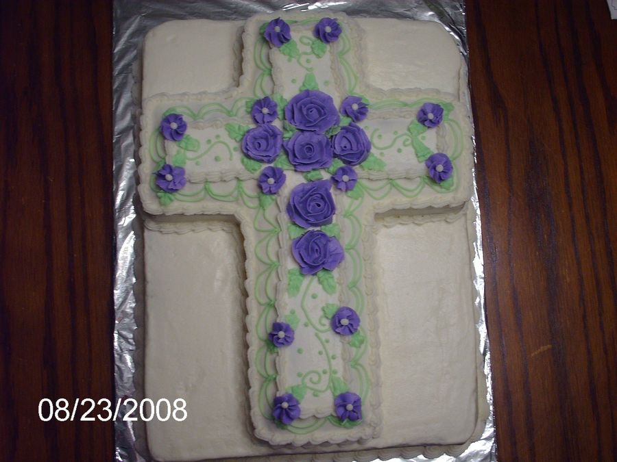 9 x 13 white cake on bottom, cross cake on top. Buttercream icing and roses.