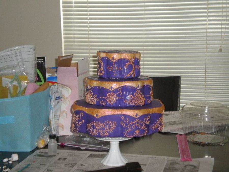 this cake was henna inspired, my own design tho, no templates just free handed it ((thats why each doesnt look identical)) not finished yet doesnt have a border, and i made flowers, but my dogs ate them hehe
