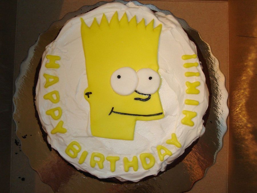 Double chocolate cheesecake, topped with whipped cream and Bart Simpson fondant overlay.