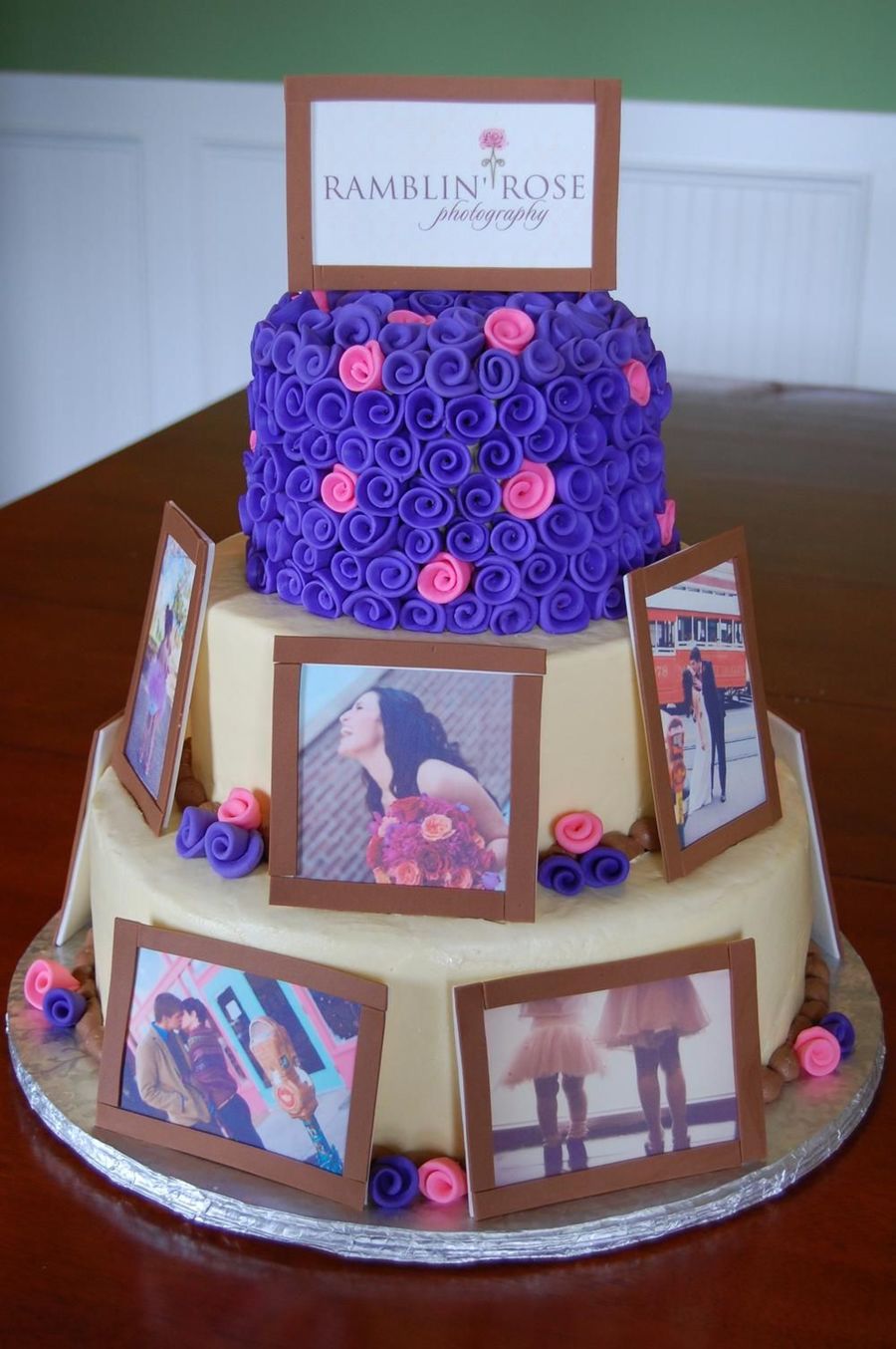 I made this cake for a photography studios grand opening,Iced in buttercream,top of the cake is covered in fondant ribbon roses,and photos are edible images on fondant
