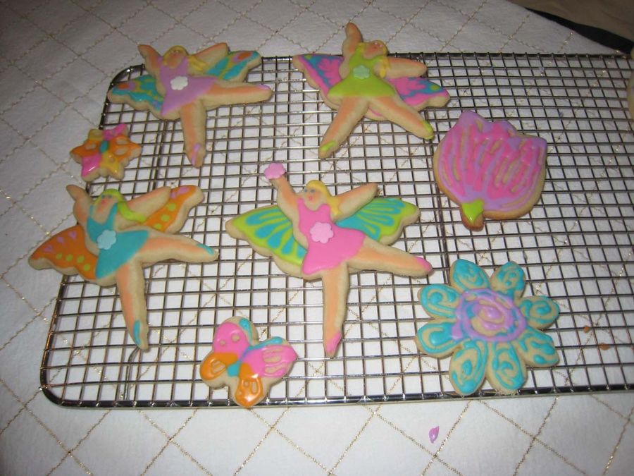 I used the ballerina cookie cutter to make fairy cookies today. I was trying to get a single nonpariel in place for the eye with a tweezer (it didn't work) when I discovered a neat hint -- I used my barely damp paintbrush to pick up the nonpariel and put it in place.