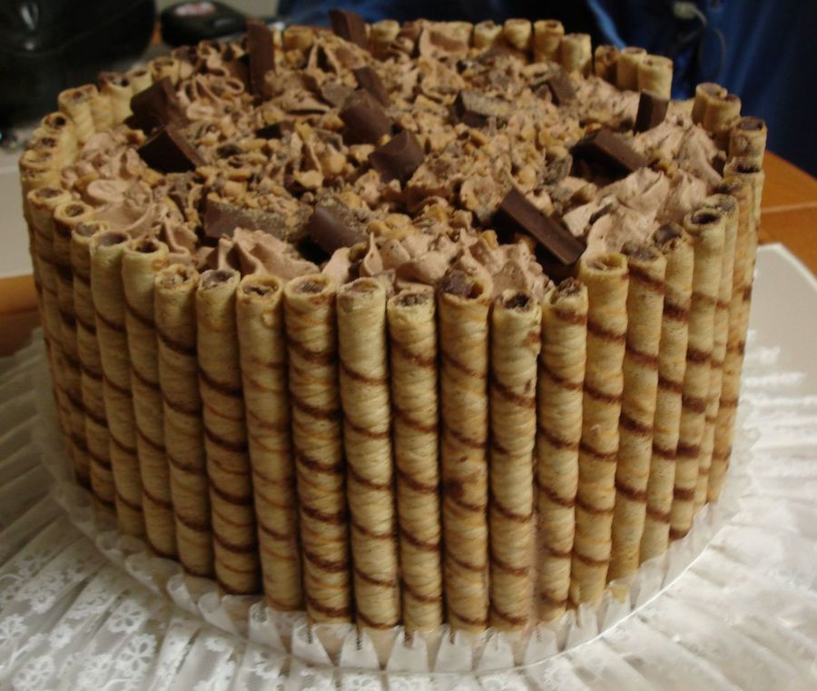 3 chocolate cake mix with chocolate pudding,white chocolate bc filling with whipped chocolate mousse covered with dove bar candys and heath crunch.Surrounded by Pirouette cookies .
