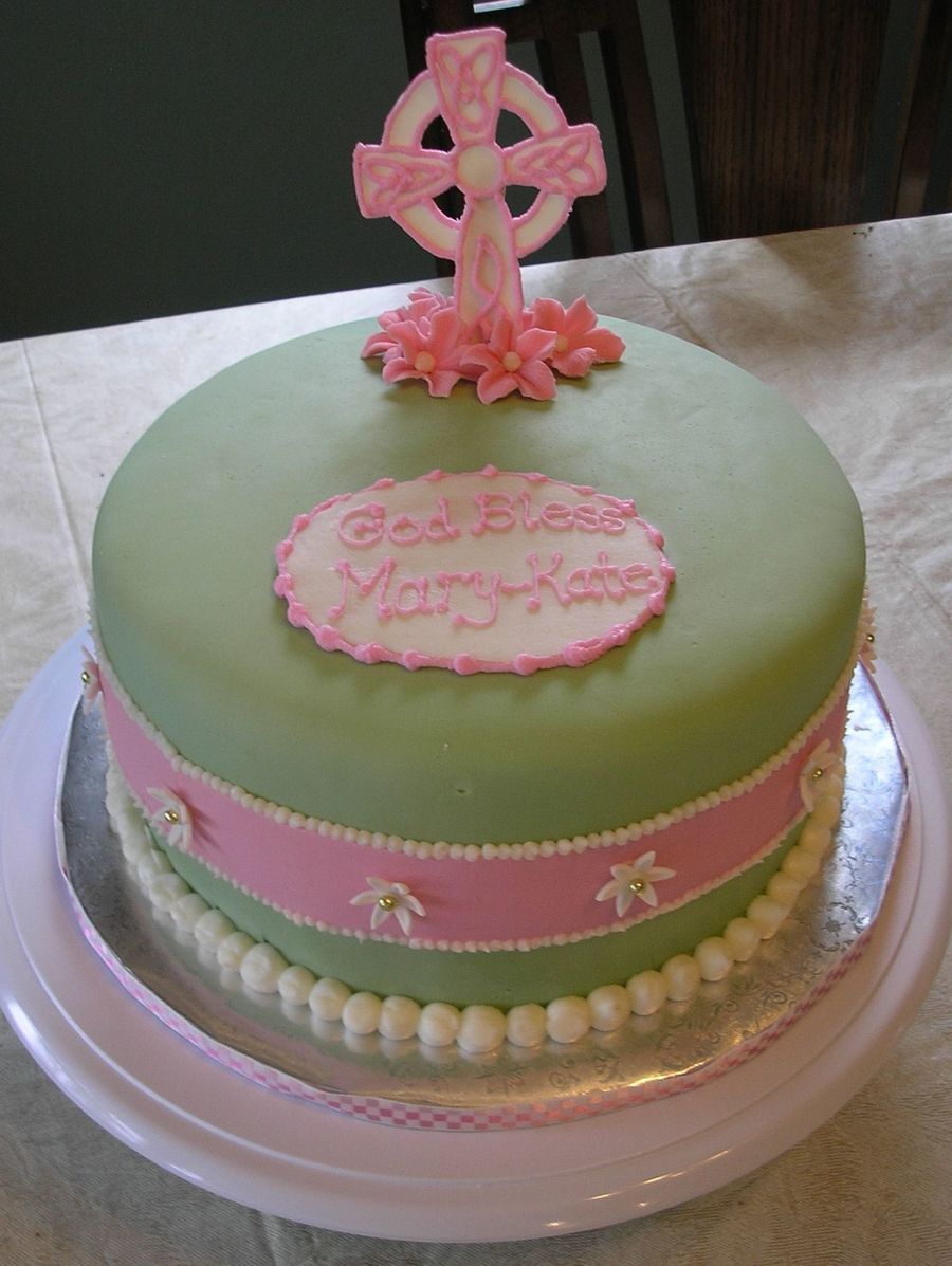 8in round covered in MFF with fondant and buttercream accents, and gumpaste flowers and cross. The fondant ribbon in the center of the cake always seems to give me problems... never straight and always trys to lose it's shape. If anyone has any suggestions, I'd love it! I'm better at the ribbon around the base of the cake.
