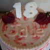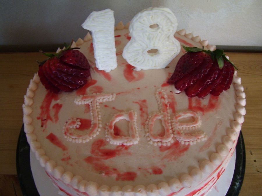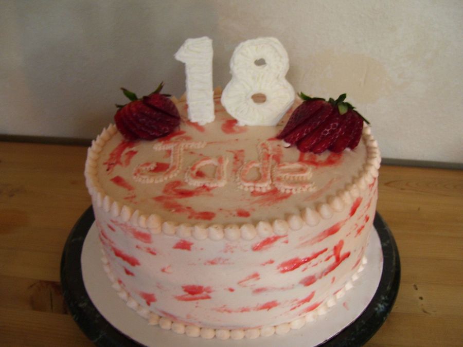 Made this cake for a Co-workers daughter, she was so excited to have her pick for her cake flavor. She said a really simple Strawberry would be just great. I believe this to be pretty simple ( better for me cause I,m no decorator)Cake was srtwbry WASC w/ strwbry crm filling . BC frosting with strwbry swirl painted on. The 18 was done with Royal & 2 real strwbrys.TFL