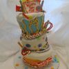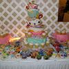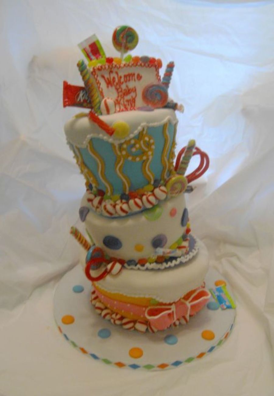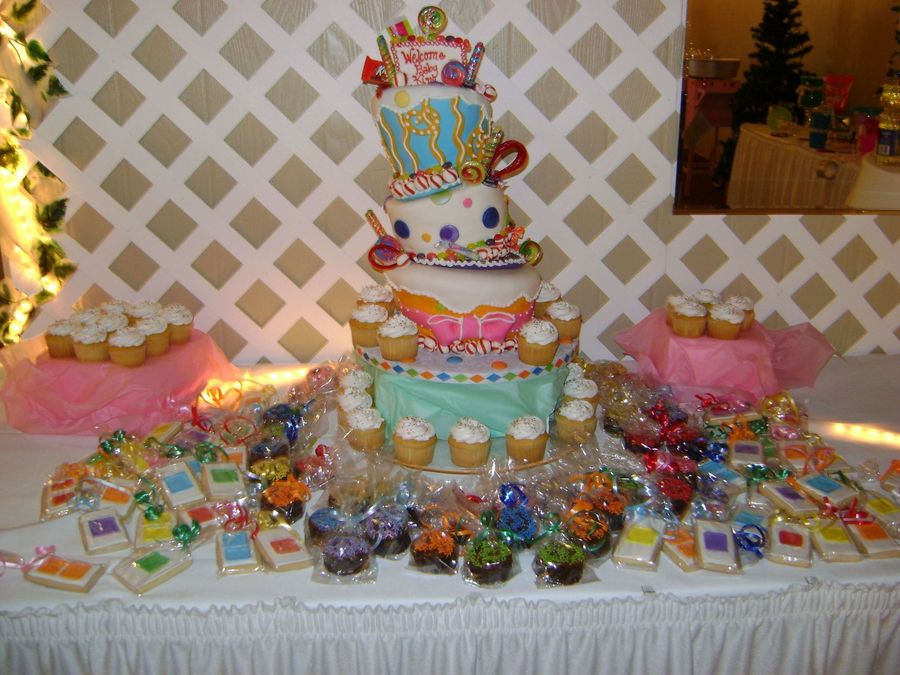 I made this cake for a friends baby shower this weekend. I have to admit it... "My name is Lynette...and I am a topsy turvy addict!!" I cannot not stop. Last month I made My first one for my nieces rock star birthday party and now I want to make everything lean. It is so much fun!!! The cake flavors are neopolitan on the top 6" tier, chocolate cake with caramel icing filling ont the middle 6" tier, and lemon cake with buttercream frosting on the bottom 8" cake. I also made Candy Land game card cookies, cut out round brownies with colored swirls and vanilla cupcakes.