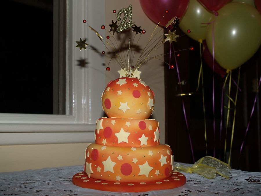 Another 'old' photo. First time spray painting (Wilton can). Top made in small pudding mold. All fondant except topper, wooden stars and beads. Rushed job. Inspiration from Lindy Smith.