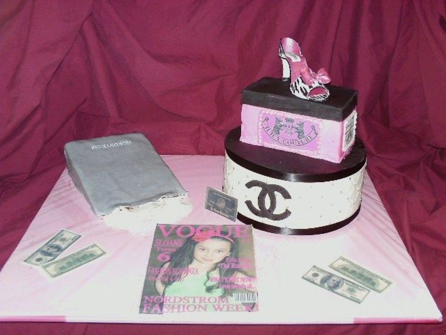 Cake, bag, chanel box, shoe box, and Vogue mag...gum paste shoe..TFL