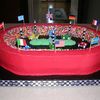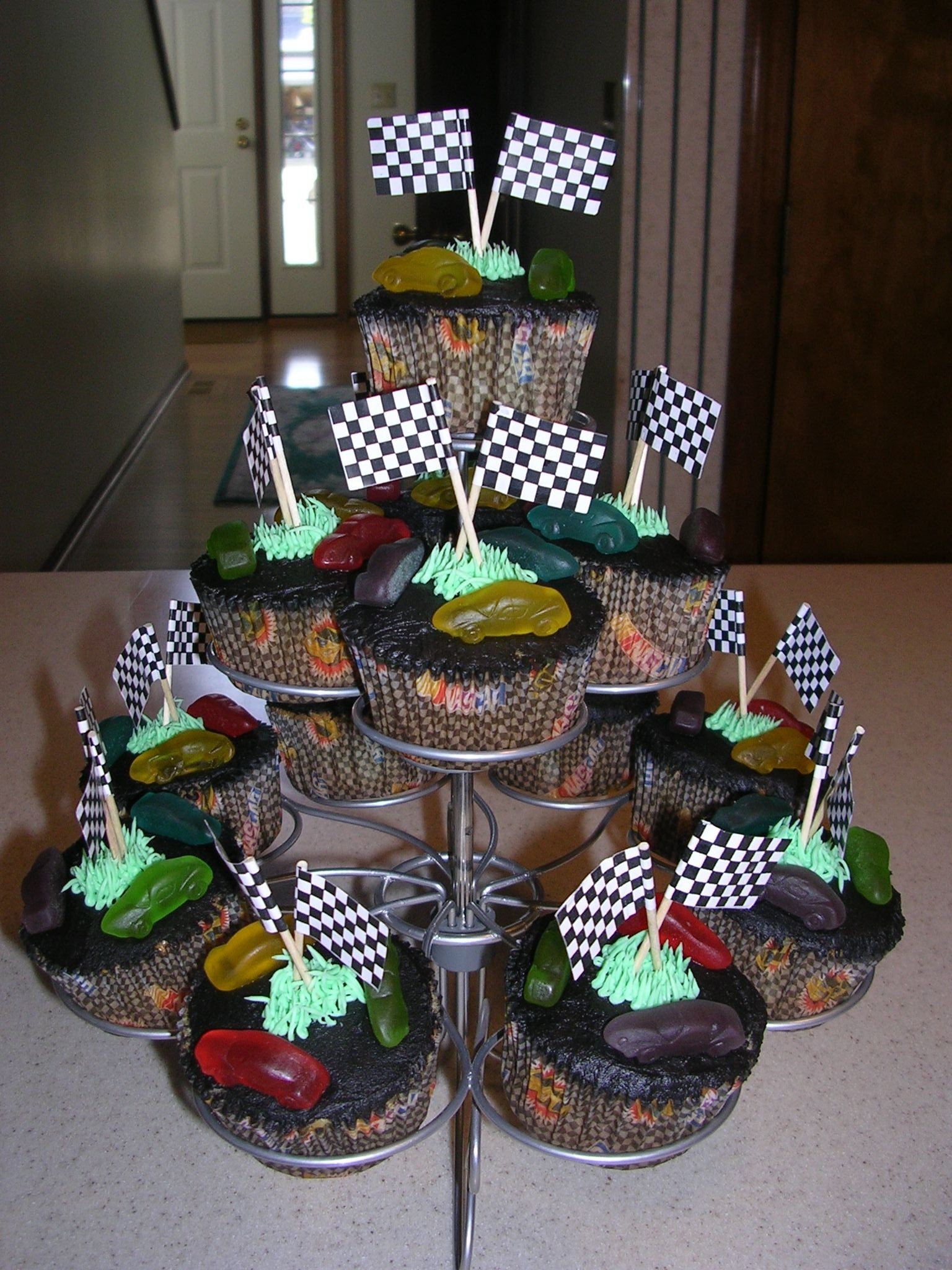 I made this cake for my sons 5th birthday. His whole world revolves around race cars! It is a double layer chocolate cake. Each layer is carved from a 12x18 cake using an oval template that I made out of posterboard. Bottom layer was iced with black buttercream to create the oval track. Top layer was carved at an angle to form the stands. The people in the stands are rainbow nonpareils. Infield area created with grass tip #233. I also included a photo of the cupcakes I made for his party.