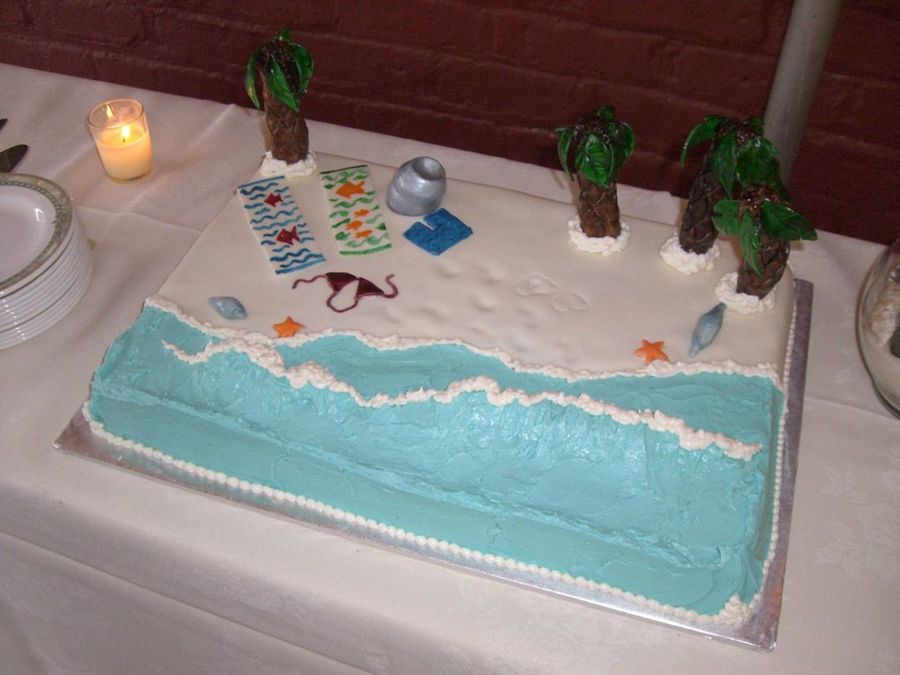 This was a 12"×18" 2-layer Piña Colada cake I made at my sister's request for her wedding reception in May '09. She and her new hubby wanted a "Beach Themed" cake with their favourite Ale represented on it (hence, the keg). This cake was a real hit at the party! I used pineapple juice, rum extract, and coconut extract instead of puréed pineapple and flaked coconut for the flavouring. Homemade pineapple filling, homemade rum-flavoured MMF for trees, beach & personal effects, BC for the waves.
