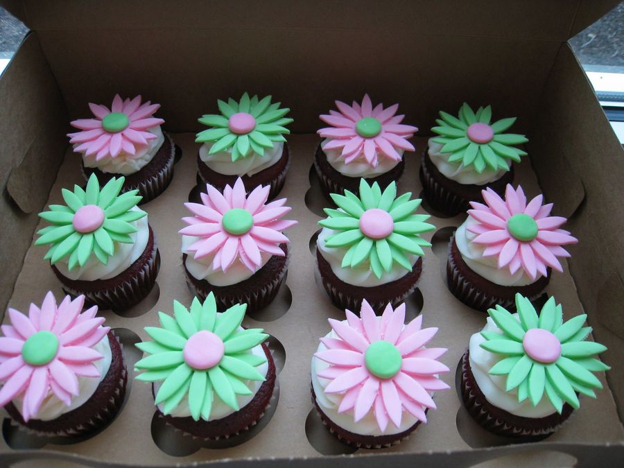Red velvet cupcakes with cream cheese frosting. Flowers are candy clay.