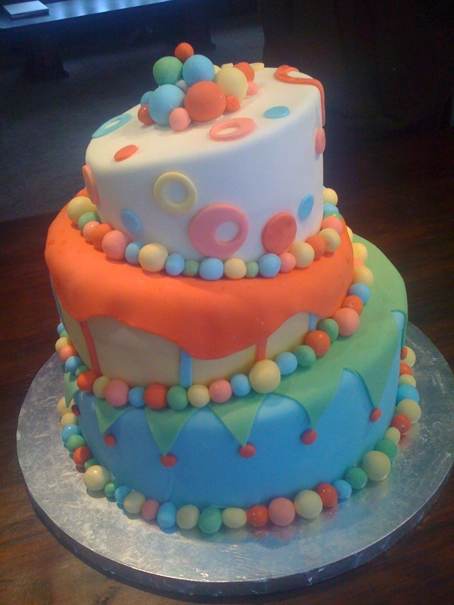 This Is my first topsy-turvy cake and my first time using fondant. This cake was made for a ten year olds birthday. It has three tiers, first one is choclate cake with cookie and cream filling, middle is white cake with lemon filling and the third is white cake with cookies and cream filling.
