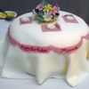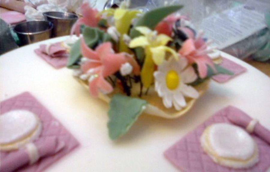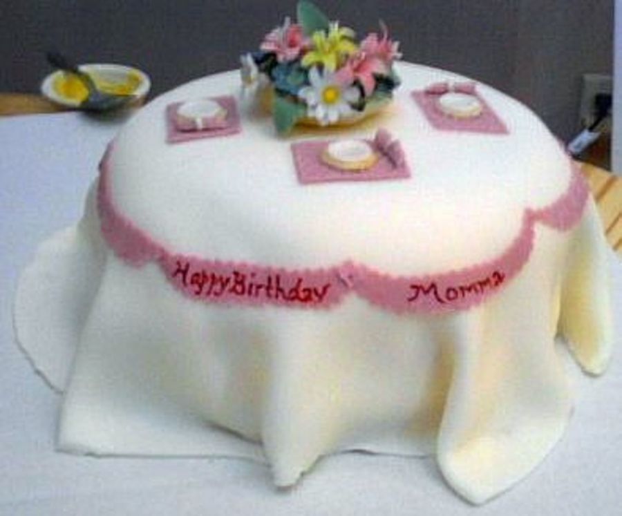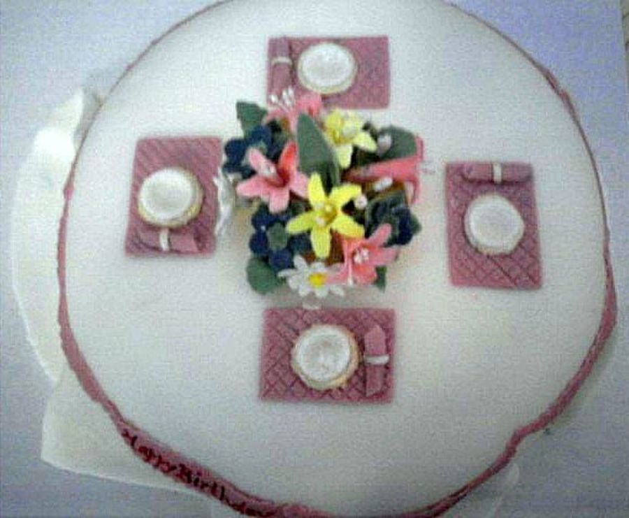 Cake for my mom's 60th birthday...she loved it! Our family is Italian, and everything is about fine dining. It's a 4-place table setting, fondant placemats, chargers, plates, and folded napkins/rings. The centerpiece is a bouquet of gumpaste flowers.