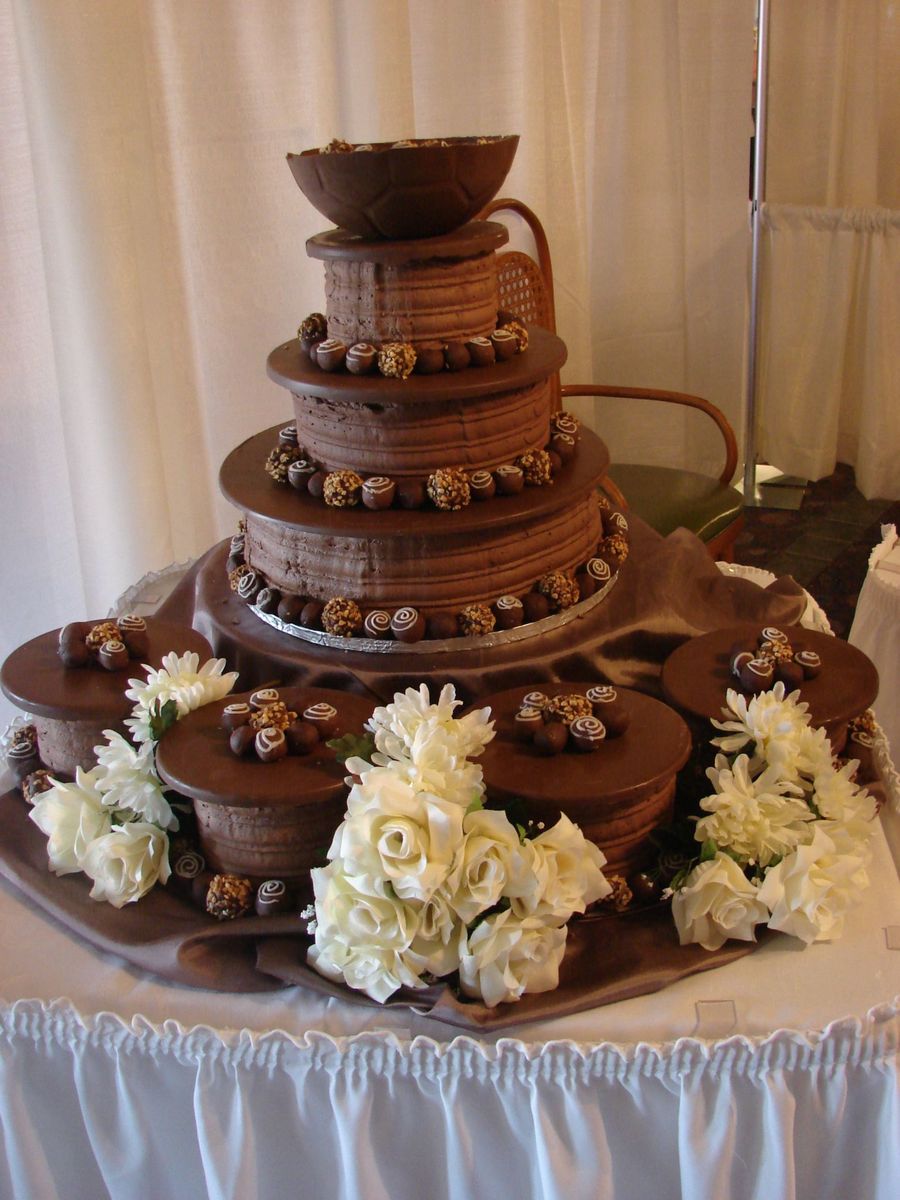 CSM. This was made for a bridal show- it was a hit with the brides-to-be and the other vendors. :) Idea adapted from the Wilton website. Iced in chocolate BC, chocolate plaques, and topped with chocolate truffles that I cheated on and made from chocolate fondant :D