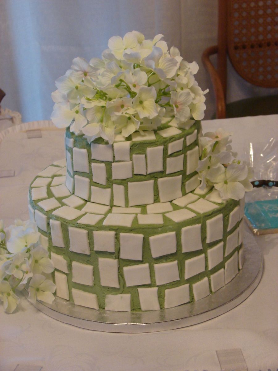 CSM. Jade BC with white fondant tiles. Flowers are silk. Another dummy cake for the bridal show.