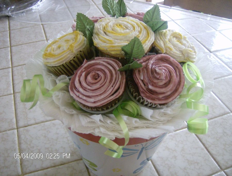 I used the cup method and the plate method and cut the middle of the plate out set the cupcakes in it and put party streamer on the edge of plate then glue it to the flower pot.