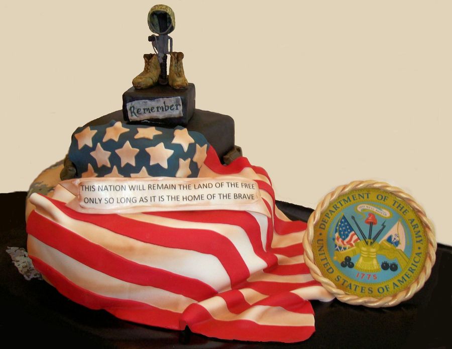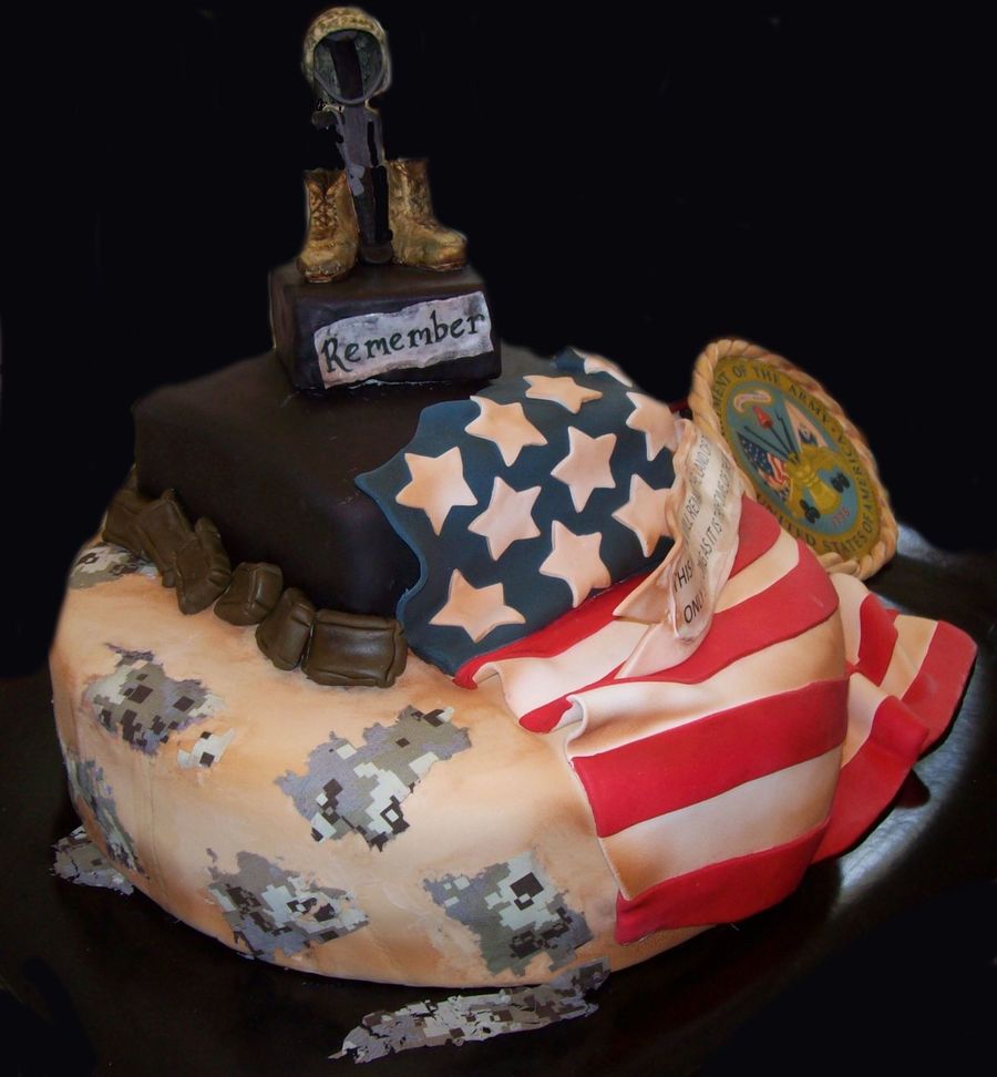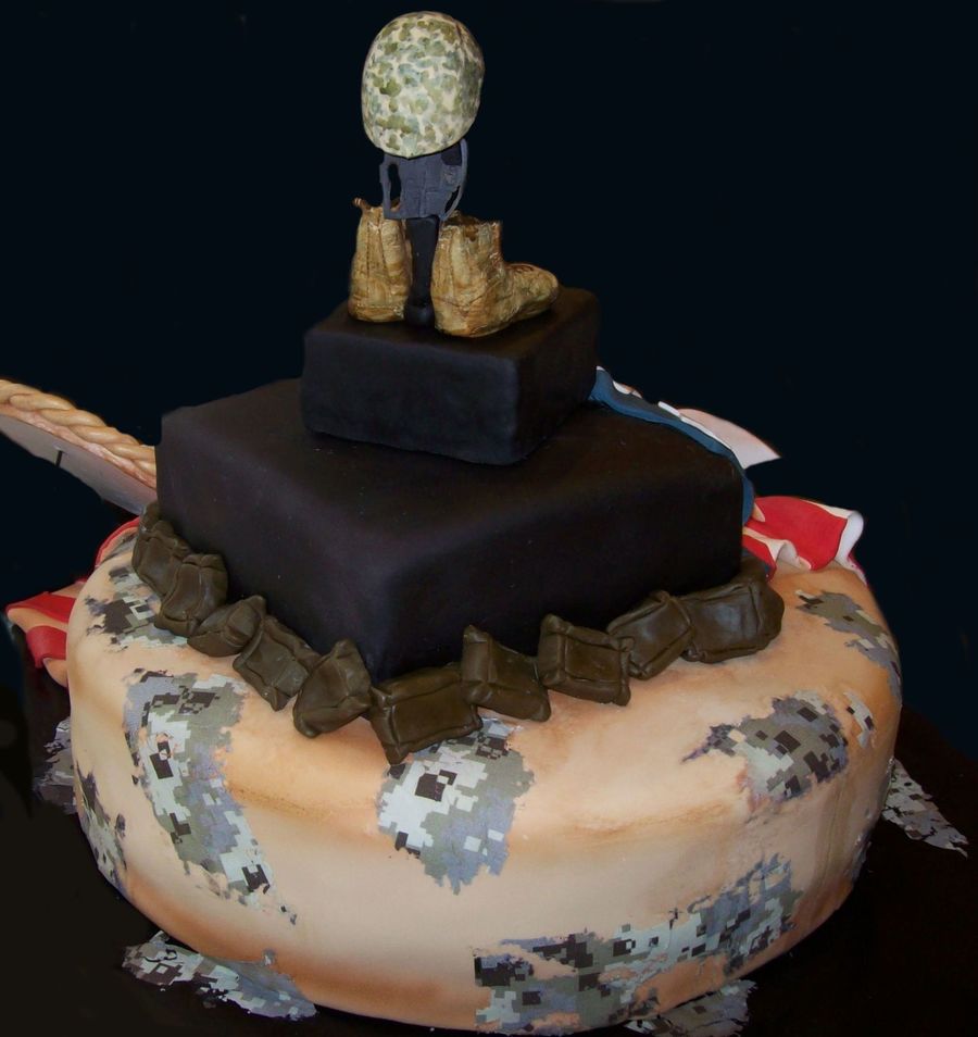 This is a cake we did for the 155 Batallion, they had a 'Dining Out' and the theme was 'remember our fallen soldiers' The topper is the fallen soldier memorial, you will the soldiers boots, rifle with the dog tags hanging the from the handle and his helmet on top of the rifle. All made from fondant. The flag and Army Seal were both made from fondant. On the back of the cake, I put the digital army pattern and some sand bags to finsh the design.