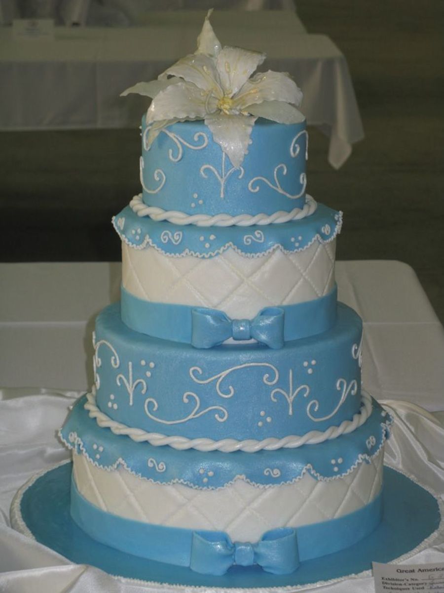 My cake for the Great American Cake Show 2009. 6-8-10-12 inch styrofoam dummies covered in rolled fondant. Piping was done in royal icing with a #2 tip. The topper is my first attempt at a gumpaste flower other than a rose, I called it a fantasy flower not a lilly because it only had 5 petals instead of 6. Behind the flower there is a tiny mouse taking a nap. Thanks for looking.