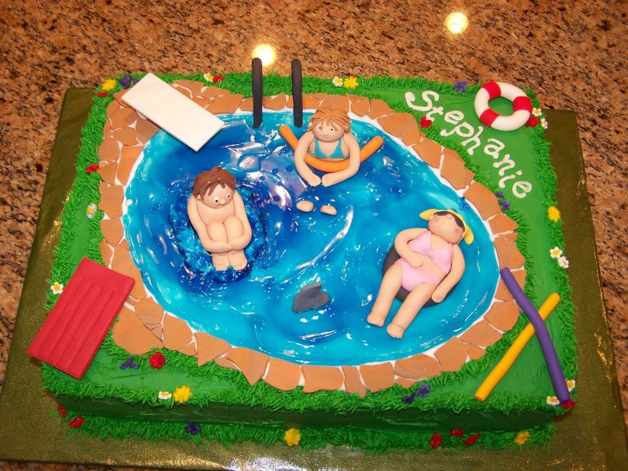 Each figure modeled after my nieces and nephew... including the surprised look on the cannonballer's face at the shark fin! Tried to make the deep end a little darker, but don't think it worked too well. Lots of adorable ideas taken from various cakes posted on CC. Sooooo very many to choose from - it was hard narrowing it down. My 6 year old cut all the flagstone work.