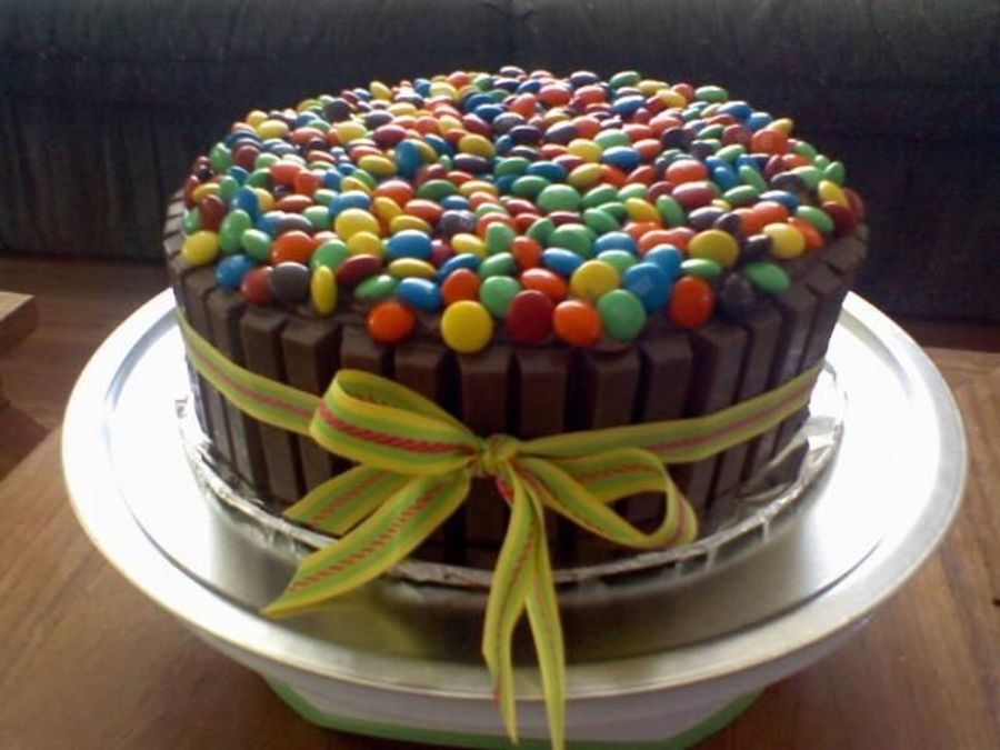 Chocolate cake, chocolate frosting, m&m's and kit kat bars.