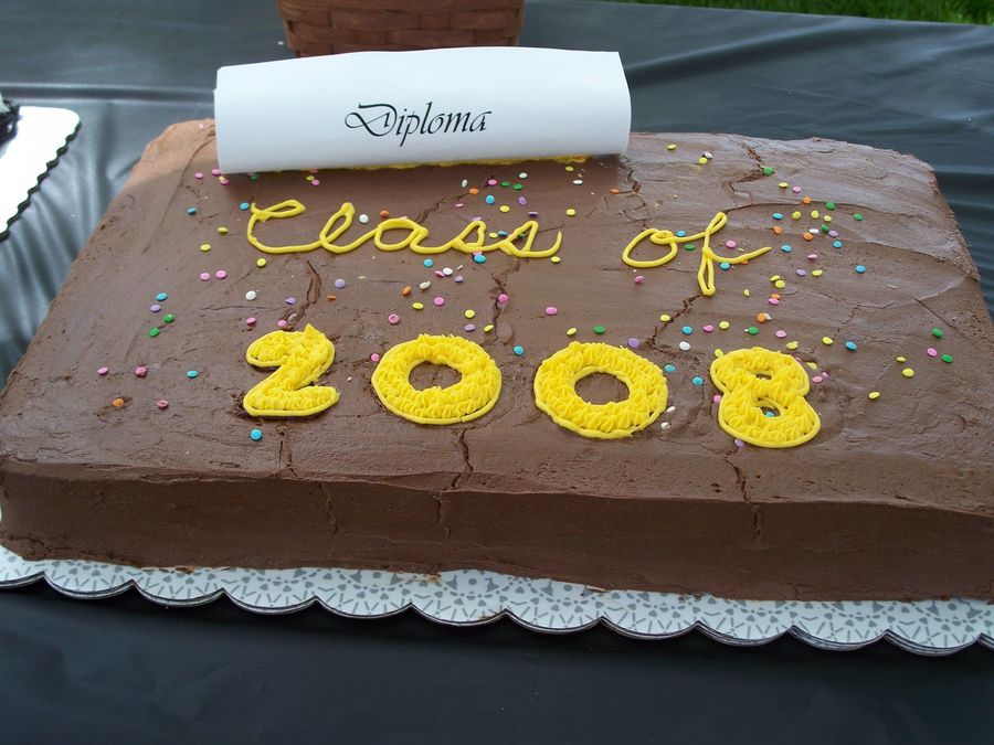 Double sheet cake. Chocolate swirl w/ chocolate B/C frosting. Free hand writing and numbers filled w/ b/c & star tip. Diploma created on computer in Old English font. Ribbon blew away in the wind.