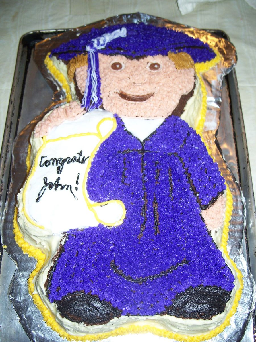 Wilton Graduate pan. All B/C frosting w/ star tip. This is really a purple gown, but in the sun/heat, purple tends to go blue. It was nice at the time.