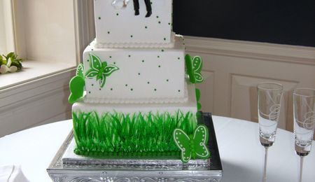 The colors are based off of a sunset. Roses on top were to match more with the pink but turned out more orange. Fondant with Fondant ribbon and bow and buttercream dots. First offset cake. Humid and Hot that day and had some bow issues especially with the bow on the back but made it work.