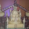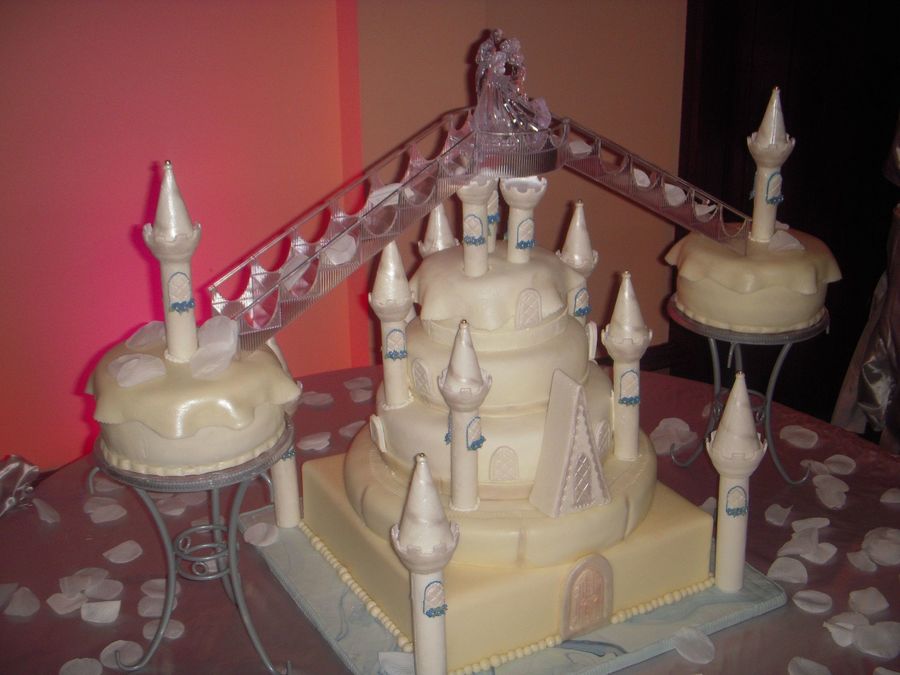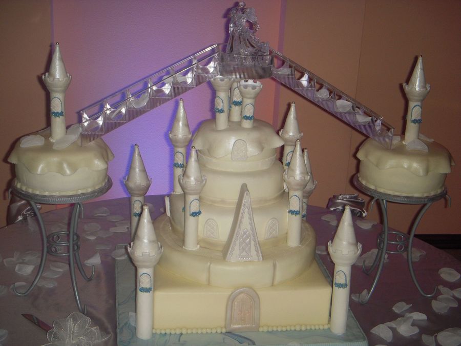 Cake covered with mm fondant. Turrets and peaks from Wilton's Romantic Castle Cake Set also covered with fondant and decorated with royal icing.