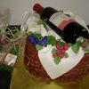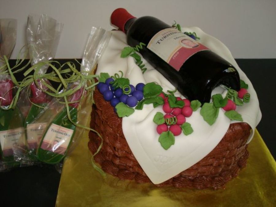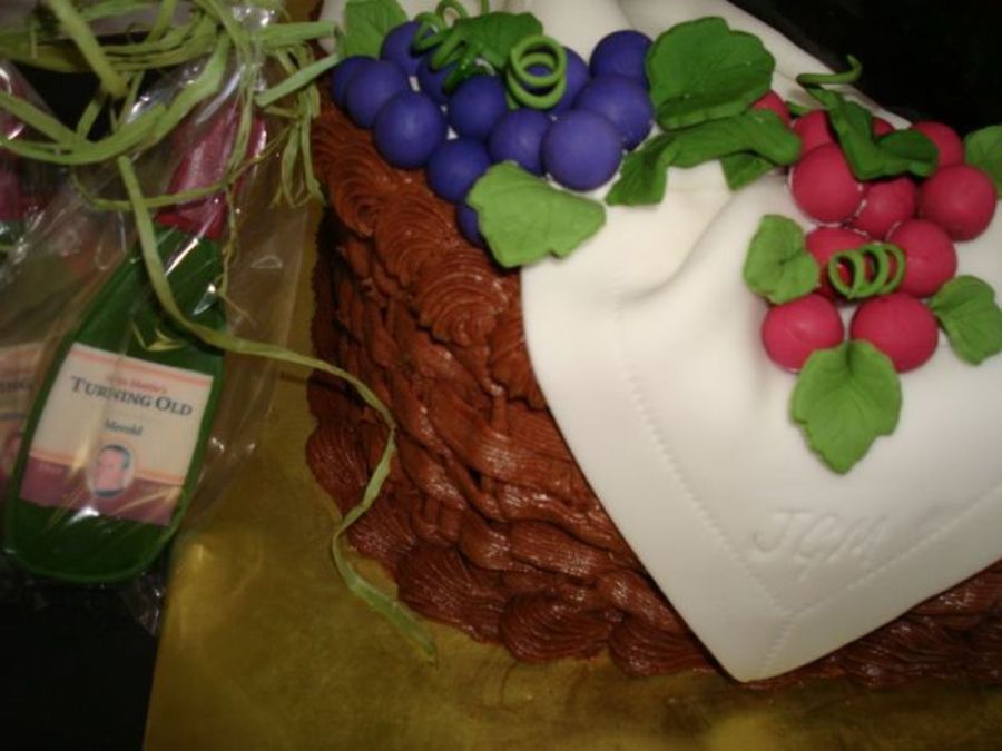 The cake is covered with chocolate buttercream. The linen and grapes are fondant. The bottle is gumpaste and the label is an edible image. I also made 40 cookies to go with the cake, these labels are edible images as well. Thanks to other CC'rs for the inspiration. TFL