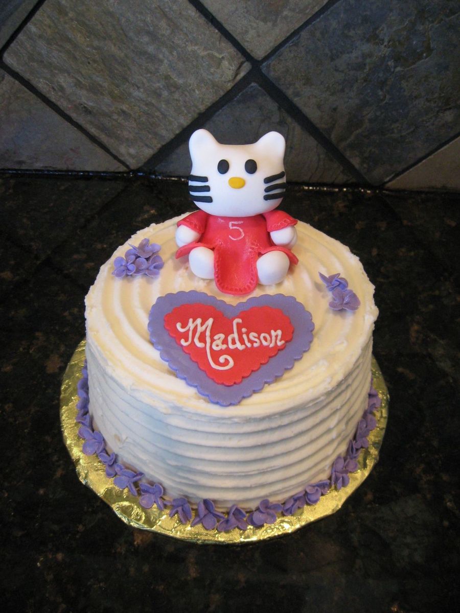 Hello Kitty is made of fondant with fondant flowers and hearts.
